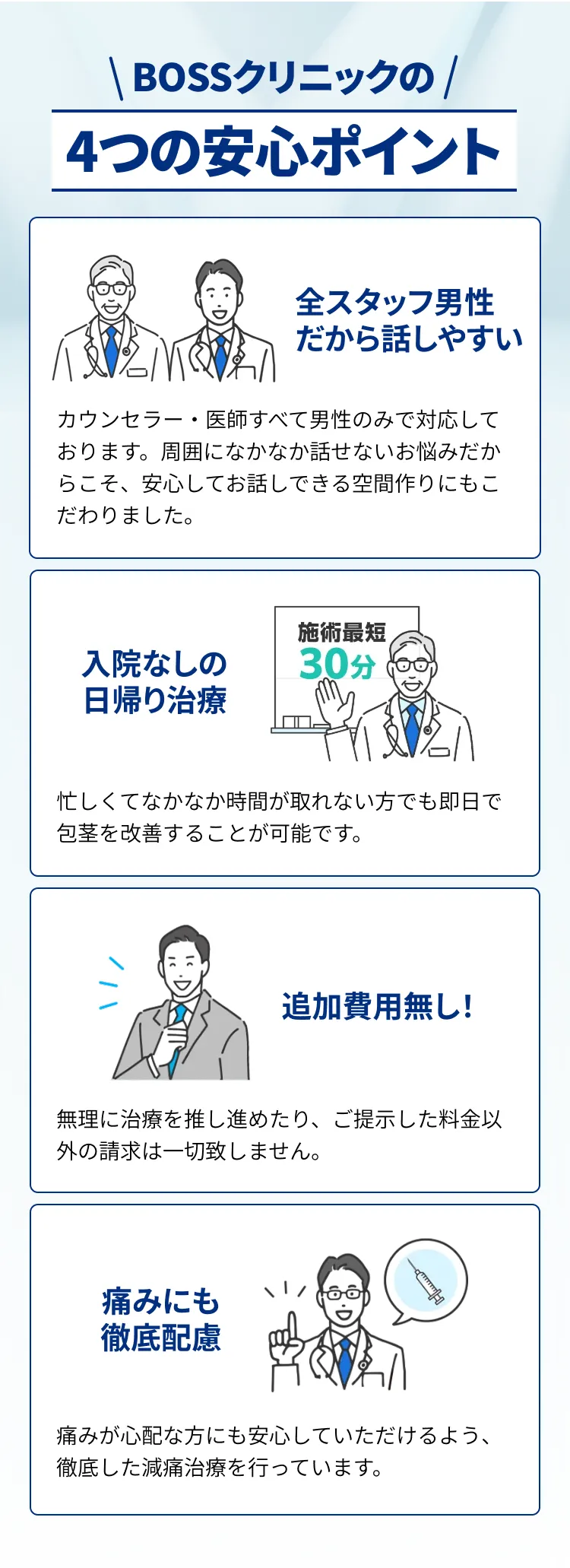 アフターケアも全て治療費込み。術後の心配事・不安にも対応します。