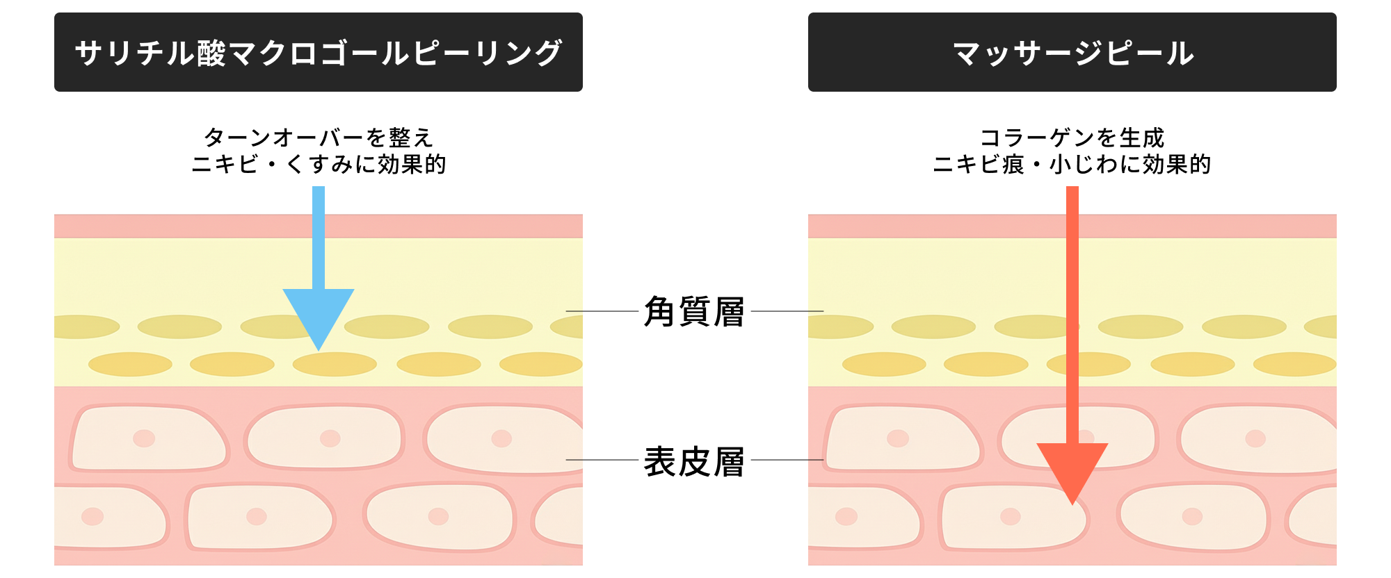 通常のケミカルピーリングは肌の表面に作用し、古い角質を剥離させることで肌のターンオーバーを整える治療です。